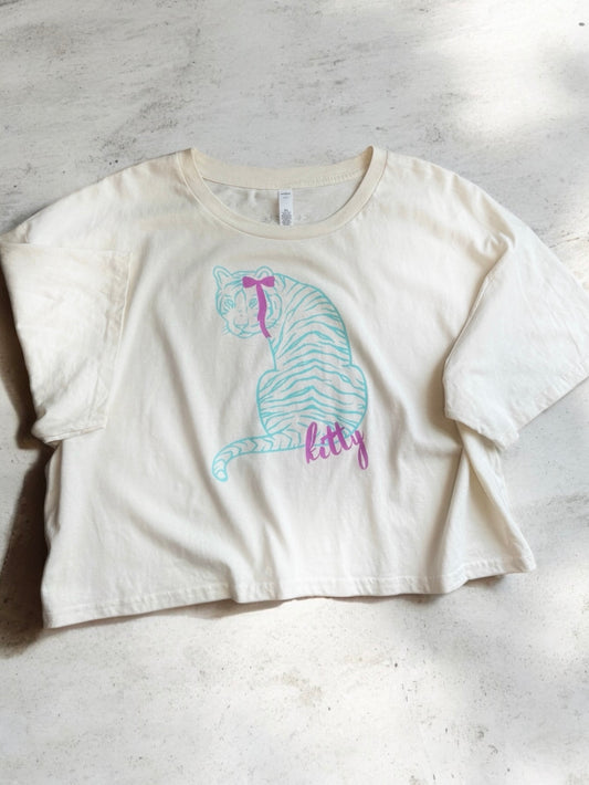 Hey, Kitty Kitty Cropped Graphic Tee with Pink Bow